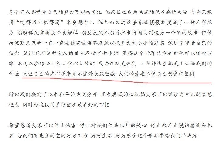 多重压力叠加之下,2015年两人正式宣布分手。分手信中写道:“只怪自己的内心并不像外表般坚强,我们的爱也不像自己想象中坚固。”